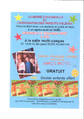 Dimanche 14 Décembre à la Salle Multi usage un après midi festif vous est offert par la mairie d'Aucamville et l'association des parents d'élèves.